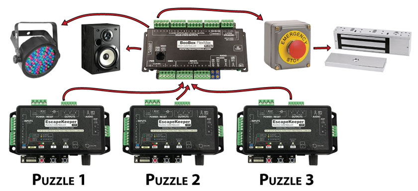 Multiple EscapeKeepers can easily be connected to each other to force players to solve multiple puzzles one after the other. You can wire them so a single door is unlocked only once all puzzles are solved, or so that individual doors or compartments are unlocked as they progress through the game. Once one puzzle is solved the next one is automatically enabled, playing any instructional messages they need to hear before the next challenge.