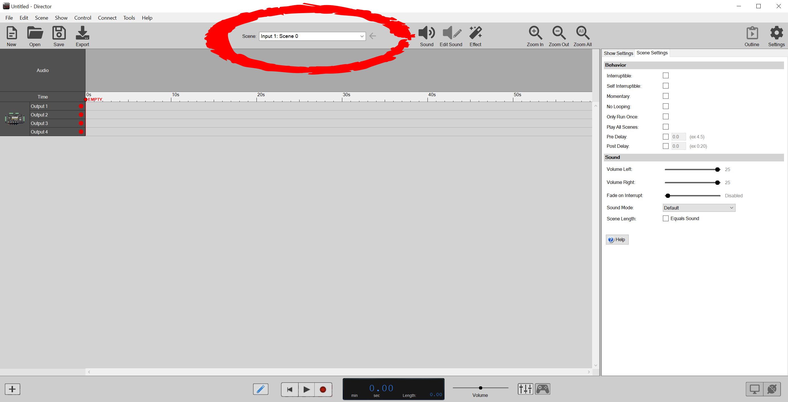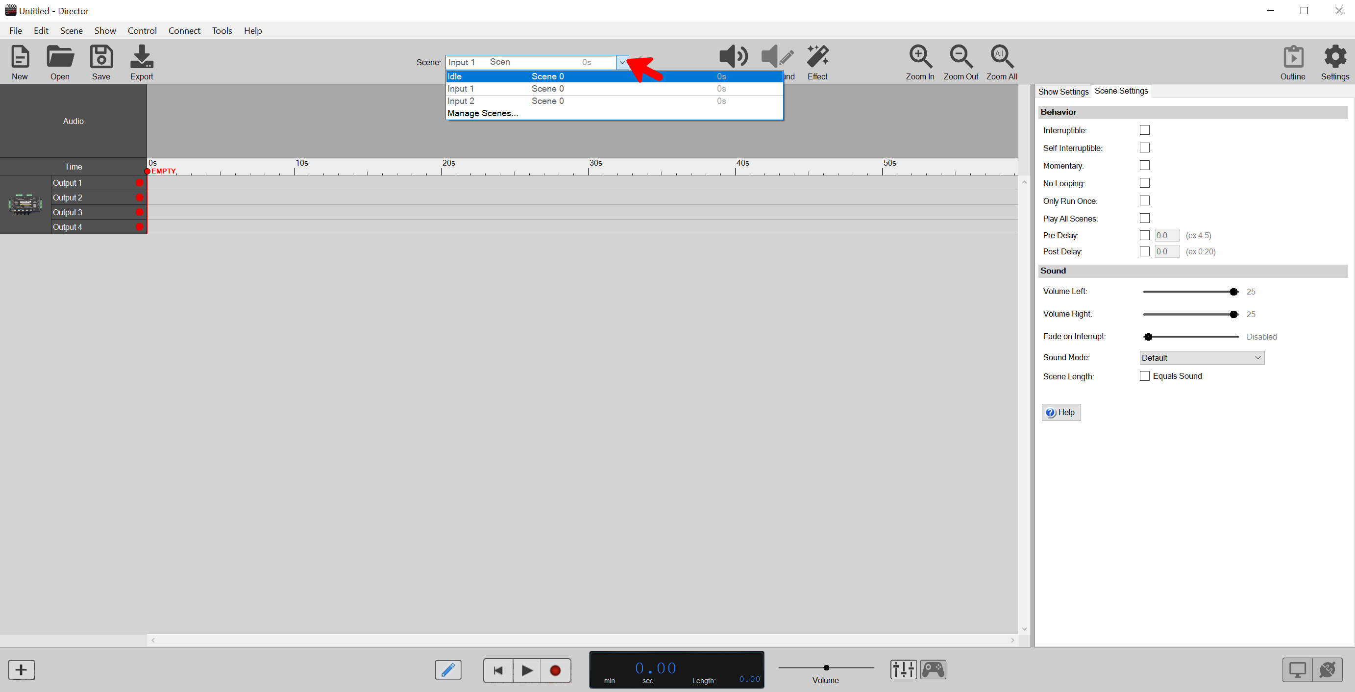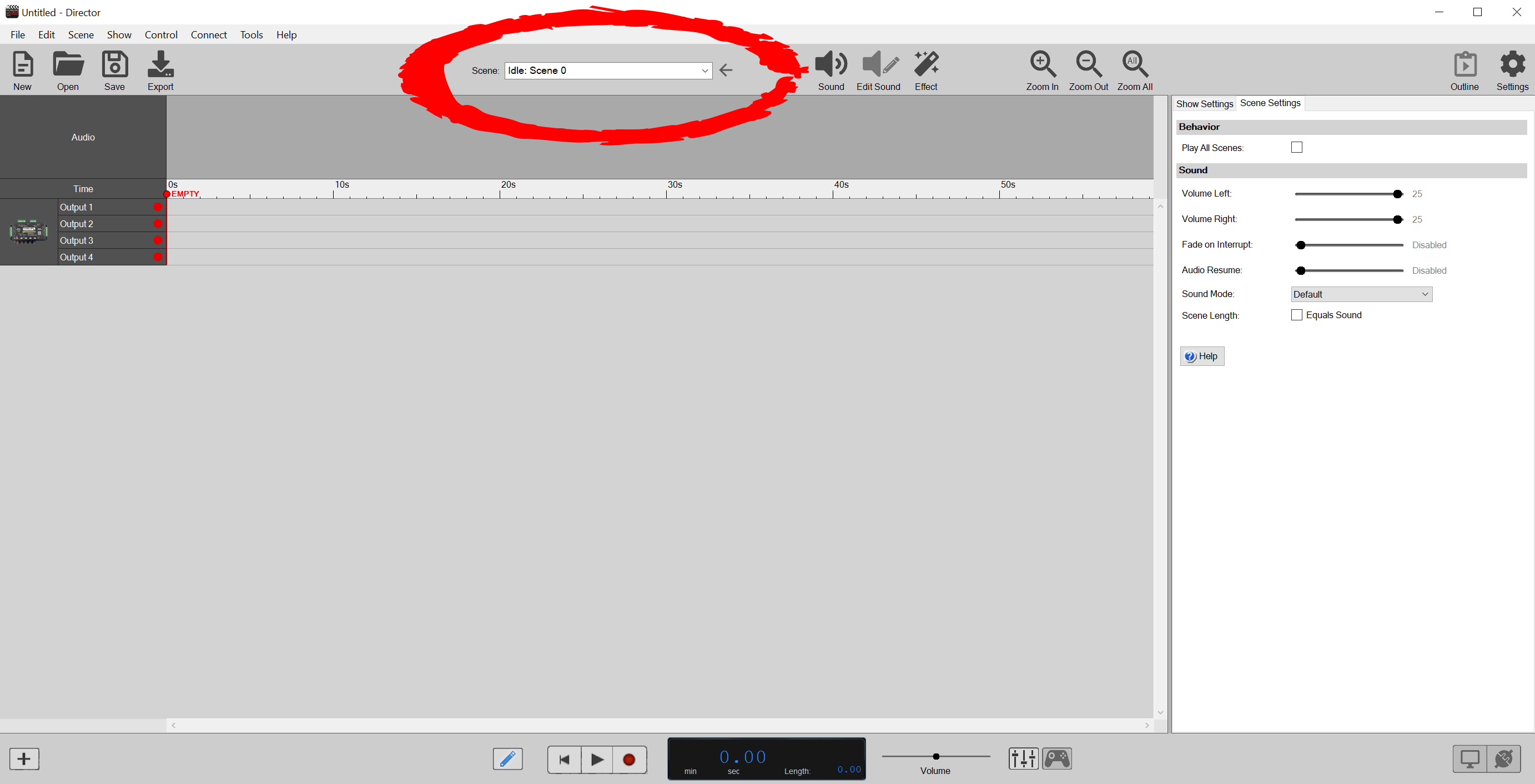 At the top center of director you will find the Scene Selection menu. Click here and select the "Idle" scene to program sound an animation for the Idle Scene.