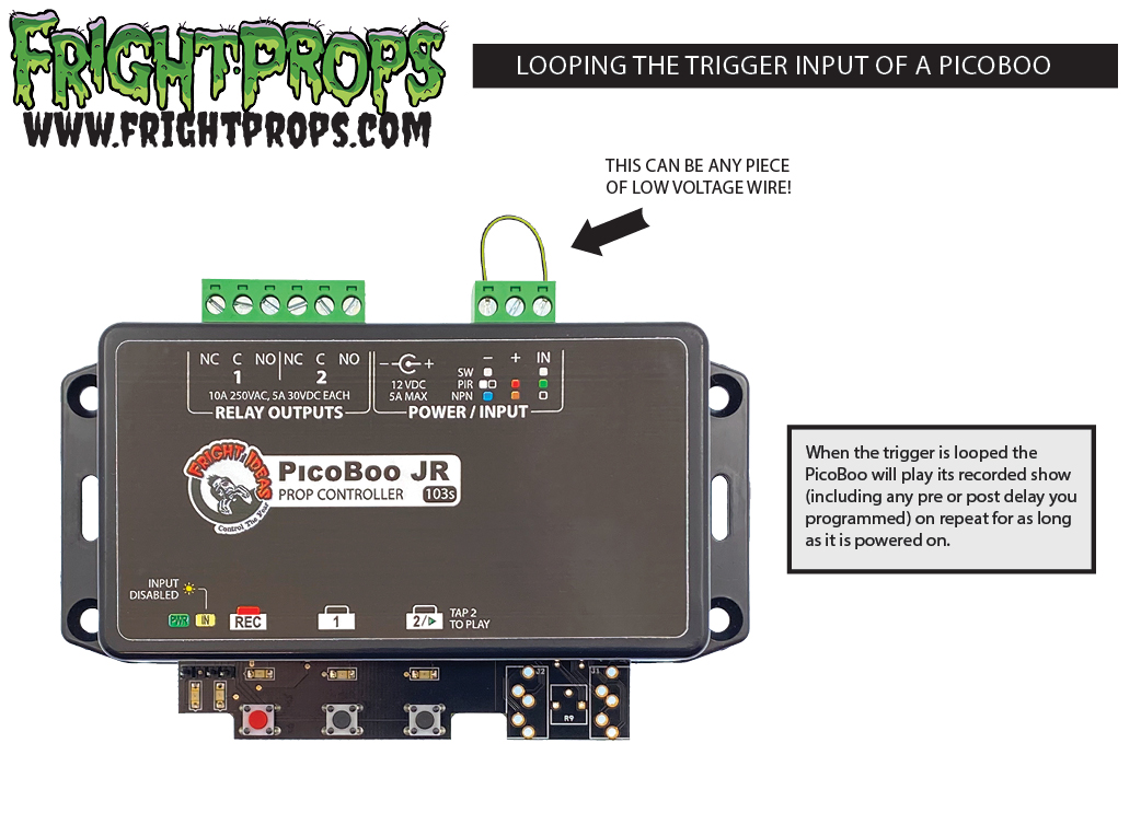 For controller like the PicoBoo ONE, PicoBoo JR and PicoBoo you can record your desired aniation as the triggered show and then "loop" the trigger input by connecting the "IN" to the "-" terminal on the trigger input.