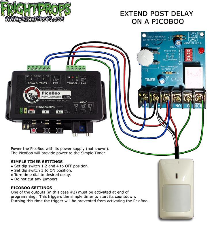 "Post Delay" is the delay after the program has run. Trigger input will be ignored during post delay so that the program won't continue to be triggered right away. The PicoBoo controllers have up to 2 minutes of animation time which also includes post delay time. To record a post delay into the PicoBoo you simply do nothing after programming before pressing the REC button to save (for example, press REC to start recording, press 1 & 2 buttons any way you'd like to program, then simply wait a number of seconds before pressing the REC button to save)