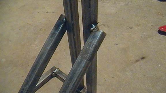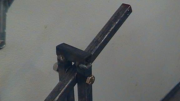 Cut two pieces about 10inches long from stock of 1/2tubing. Cut the tips off of them so that the ends have a 45degree angle. Afterwards, weld these pieces from the top of the crossbar in the U-piece (45degree edge down) to the outer sides of the two vertically pointing rods.