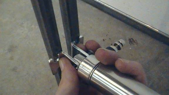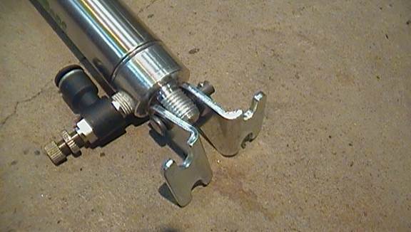 Now it’s time to attach the pneumatic. You want to attach the base brackets to the vertical shafts of the rig and the clevis bracket to the underside of the rig arm (keeping in mind that if it’s a ground mounted rig, you don’t want the arm to ever drop below ground level) so that when the pneumatic’s rod is retracted, the arm is lifted, and when the rod is extended, the arm is lowered.