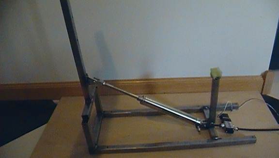 The hard part is over! If you’ve already drilled holes in the base of your rig (the U-shaped piece) then use those holes to mount your rig to a wide platform of wood (plywood is ok). You’ll need to mount it to a platform of wood to keep the rig sturdy and keep it from flipping itself over. Any increase in prop weight, cylinder bore size, or PSI supplied to the cylinder will require a larger or heavier base platform to mount the rig to.