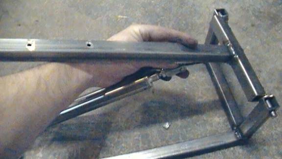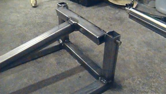 You’ll probably have a little 3/4inch metal tubing left over. You can use this to make a brace for the arm when the pneumatic is retracted. This is to absorb the impact of the pneumatic retracting: taking stress off of the pneumatic itself and making absolutely sure that the arm doesn’t swing down too far and lock up, in case you welded the clevis bracket too close to the arm pivot. Just cut the metal to approximately the vertical distance between the pivot bracket tube and the arm. Weld it in place and add something soft and squishy (such as foam or a rag) to the top of it to absorb the impact and prevent the loud CLANG that comes with two pieces of metal knocking together.