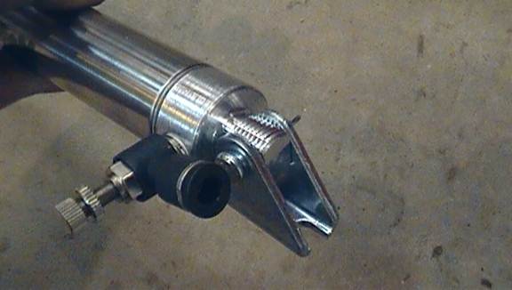 This is the base of your air cylinder. This picture is of the pivot bracket before it was welded on (yours will already be welded on, but it attaches the same way). This also shows a male connector with flow control (optional. The flow control will regulate how fast the cylinder retracts its rod). You can use any regular push-on male connector. Be sure to use pipe thread sealant tape when installing air hose pieces, and use a wrench to tighten.