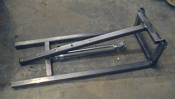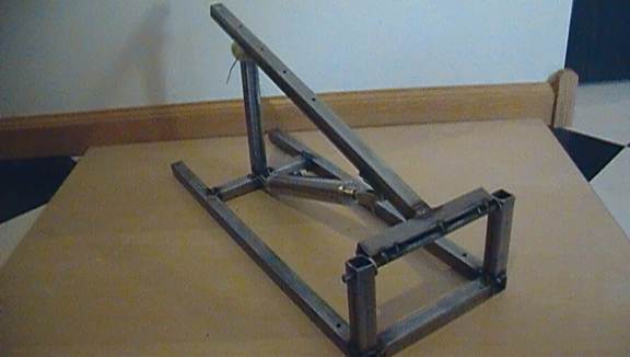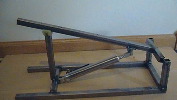 Before committing to any permanent welds, when you think you have the right positions, tack weld them in place. Double and triple check that when the pneumatic is retracted, the arm rests without swinging downwards and that when the pneumatic is extended, the arm points directly upwards (see the second picture of this instructional).