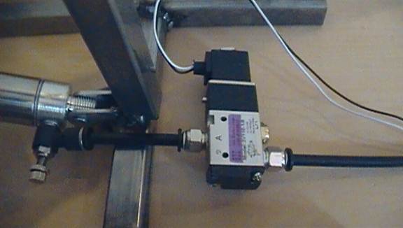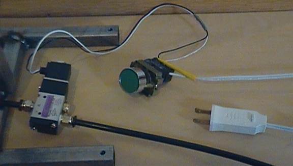 To activate the solenoid, and as a result your pneumatic rig, you need to supply it power. If you bought a 110VAC activated solenoid, you just need to splice a power chord and solder or crimp the wires together. Plugging the cord in will turn the solenoid on and the cylinder will extend. Unplugging it will turn the solenoid off and the cylinder will retract.