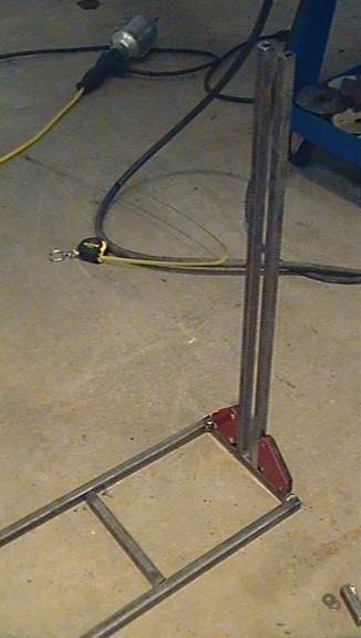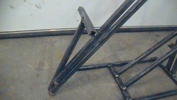 Cut two pieces about 10inches long from stock of 1/2tubing. Cut the tips off of them so that the ends have a 45degree angle. Afterwards, weld these pieces from the top of the crossbar in the U-piece (45degree edge down) to the outer sides of the two vertically pointing rods.