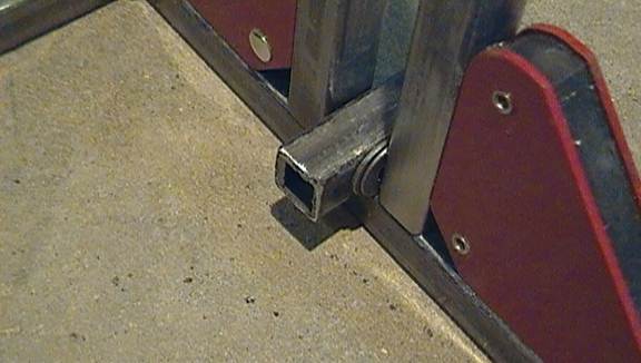 Cut two 20inch long pieces of 1/2inch steel tubing. Weld them in the center of the U’s “bottom” edge with a gap between the two pieces large enough to fit a third piece of 1/2inch steel tubing and two washers between them.