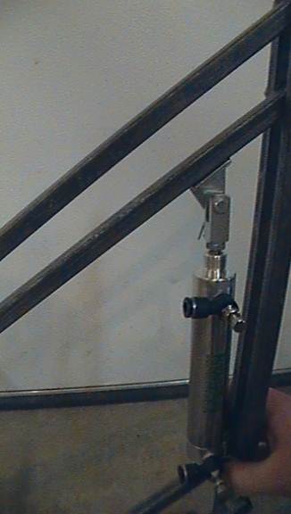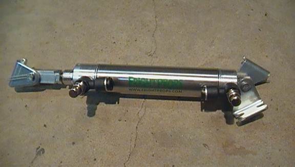 Now it’s time to attach the pneumatic. You want to attach the base brackets to the vertical shafts of the rig and the clevis bracket to the underside of the rig arm (keeping in mind that if it’s a ground mounted rig, you don’t want the arm to ever drop bellow ground level) so that when the pneumatic’s rod is retracted, the arm is lowered, and when the rod is extended, the arm is lifted.