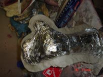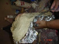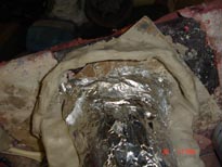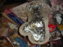 We will now prep for and apply the mother mold. Press tin foil onto surface of the object. Make sure all areas are covered tightly and make sure area around the object is covered.