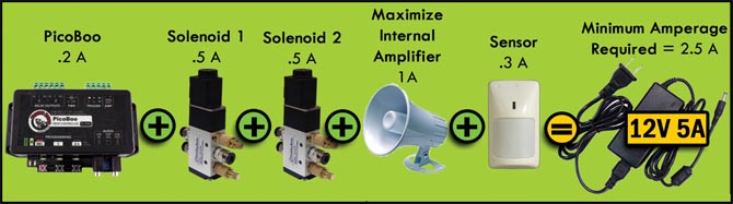This example shows how to add up the amperage requirements of all devices connected to a single power supply. As shown, the total power draw is 2.5A and the closest power supply that works is the 12V 5A. It is always better to use a higher amperage power supply than required.