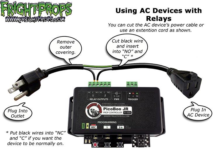 Relays act as a switch that contact two wires together completing the cicuit. Several of our controllers contain relays such as the PicoBoo, PicoBoo Jr, PicoBoo Plus, PicoBoo Max, and the Simple Timer.