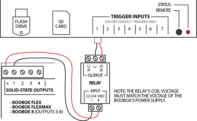 If your controller has solid-state outputs (such as the BooBox Flex) then you must use a relay board such as this: