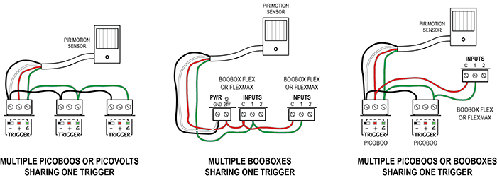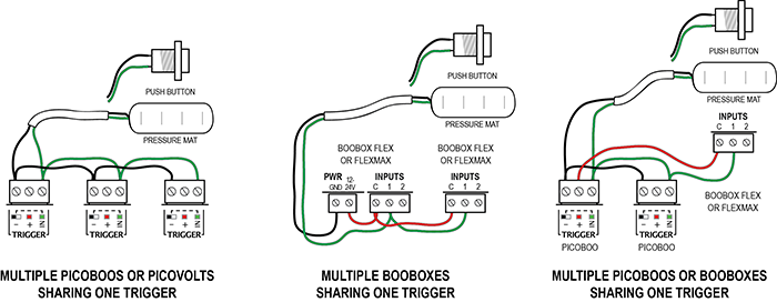 Connect multiple controllers to a single trigger using the diagrams below as a guide.